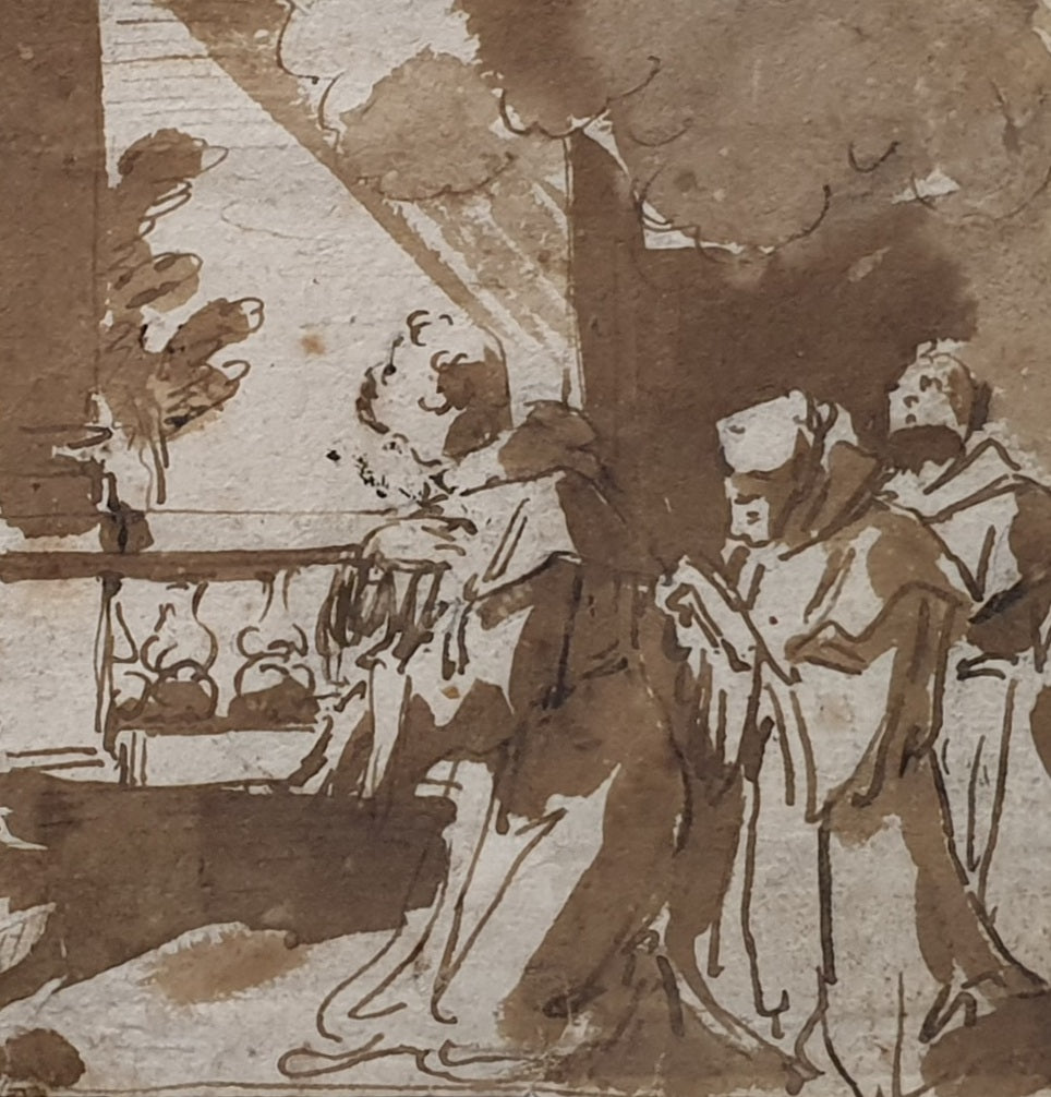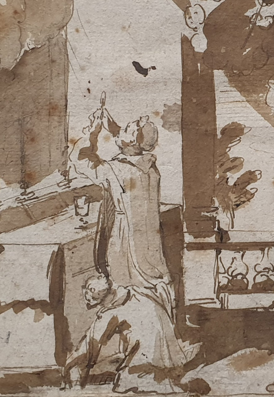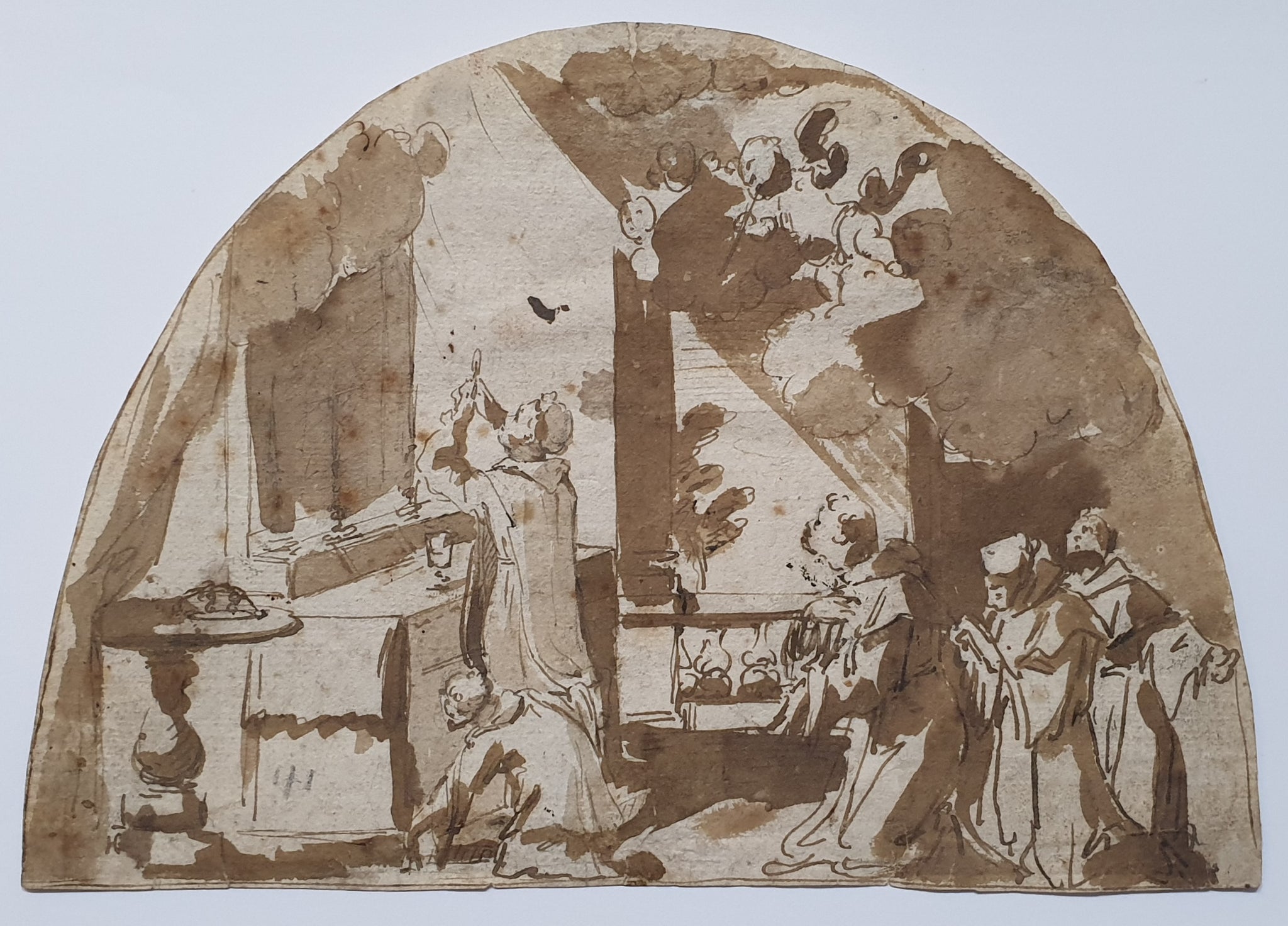 Alessio Gemignani 1567-1651 Italian School 17th.Century Pen Ink and brown wash drawing. A design for a lunette depicting the consecration of the eucharist. Executed on laid paper trimmed to lunette, some soft creasing and skinning to reverse, to no real detriment. 19.5 by 13.5 cms.