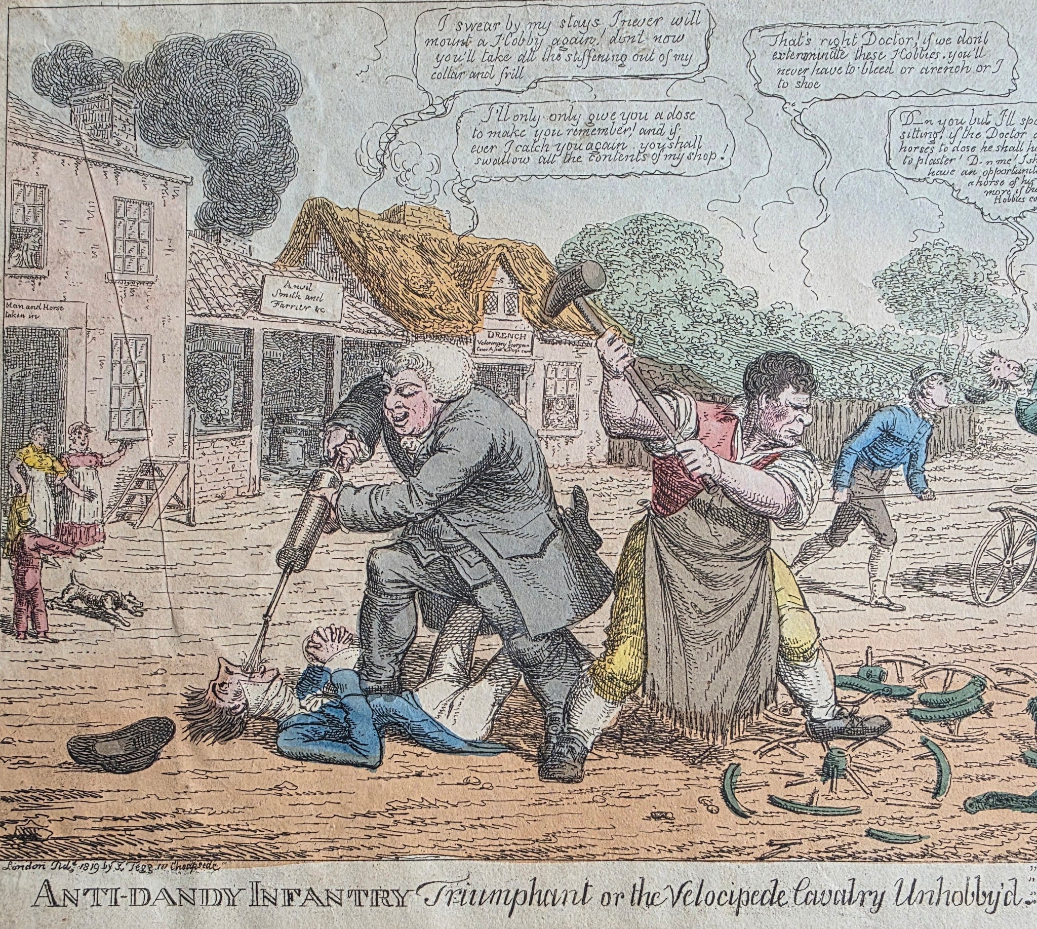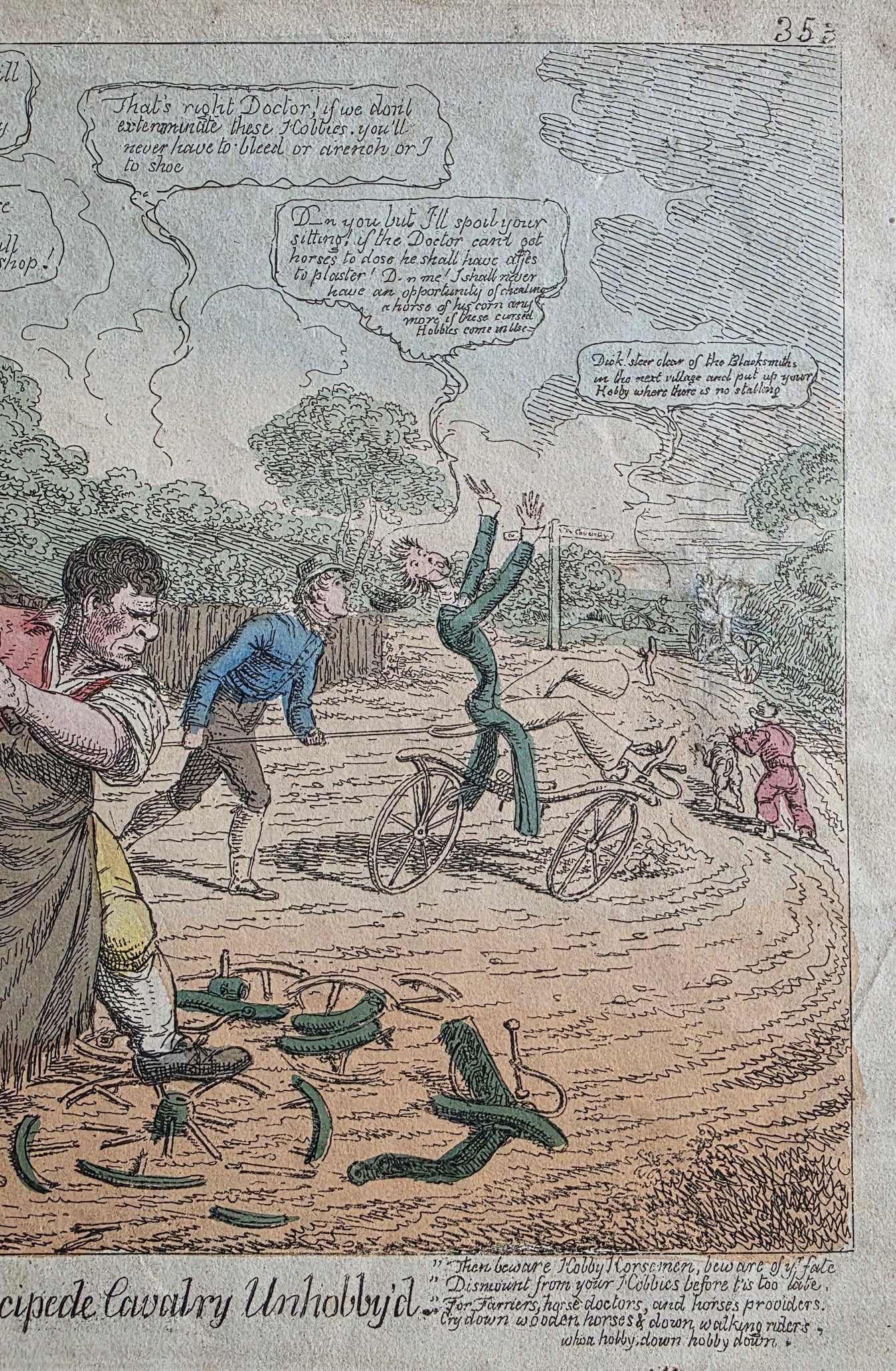 Anti-Dandy Infantry Triumphant or the Velocipede Cavalry Unhobby'd. Hand coloured etching by Williams published by T Tegg Cheapside London 1819. Printed on early wove paper laid on to backing sheet, some general timestaining and surface abraision to no real detriment. 36.5 by 26 cms sheet overall. BM Ref 13412. RARE.