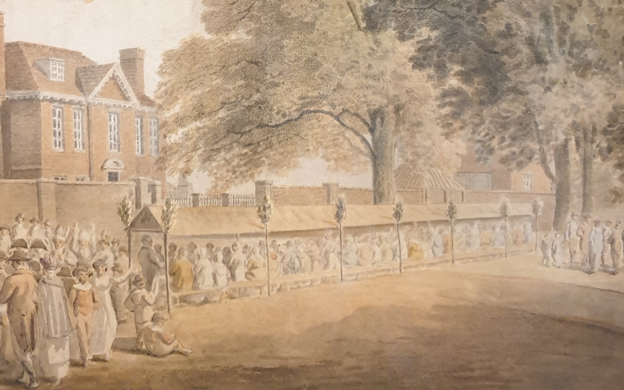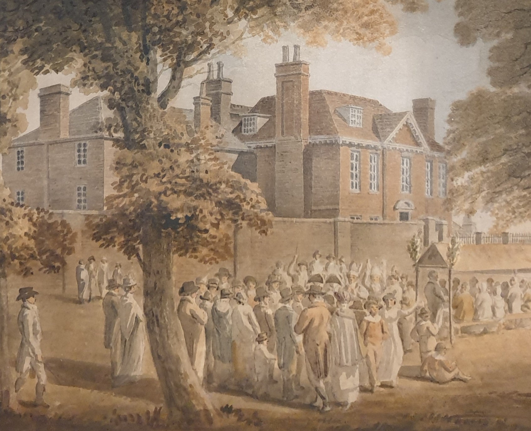 Attr. Michael Vincent Charles Brandoin. 1733-1807. Anglo-Swiss School 18th.Century. A large scale watercolour depicting a gathering before a country house. Watercolour on wove paper. 56 x 35.1 cms. Image. 76 by 55.5 cms. Framed overall. Provenance: Derek Plint Clifford (1915-2003) his sale Christies London 16/11/1965 Lot 99 as Charles Brandoin. Bt. Cornish Torbock (1905-1993), his executors sale Sothebys London 14/04/1994 Lot 136 as Attr. JM Barralet. Sothebys 06/07/2023 Lot 185 as English School. Given that Derek Clifford's knowledge of English Watercolours was extensive, I believe his original attribution to Brandoin to be correct.