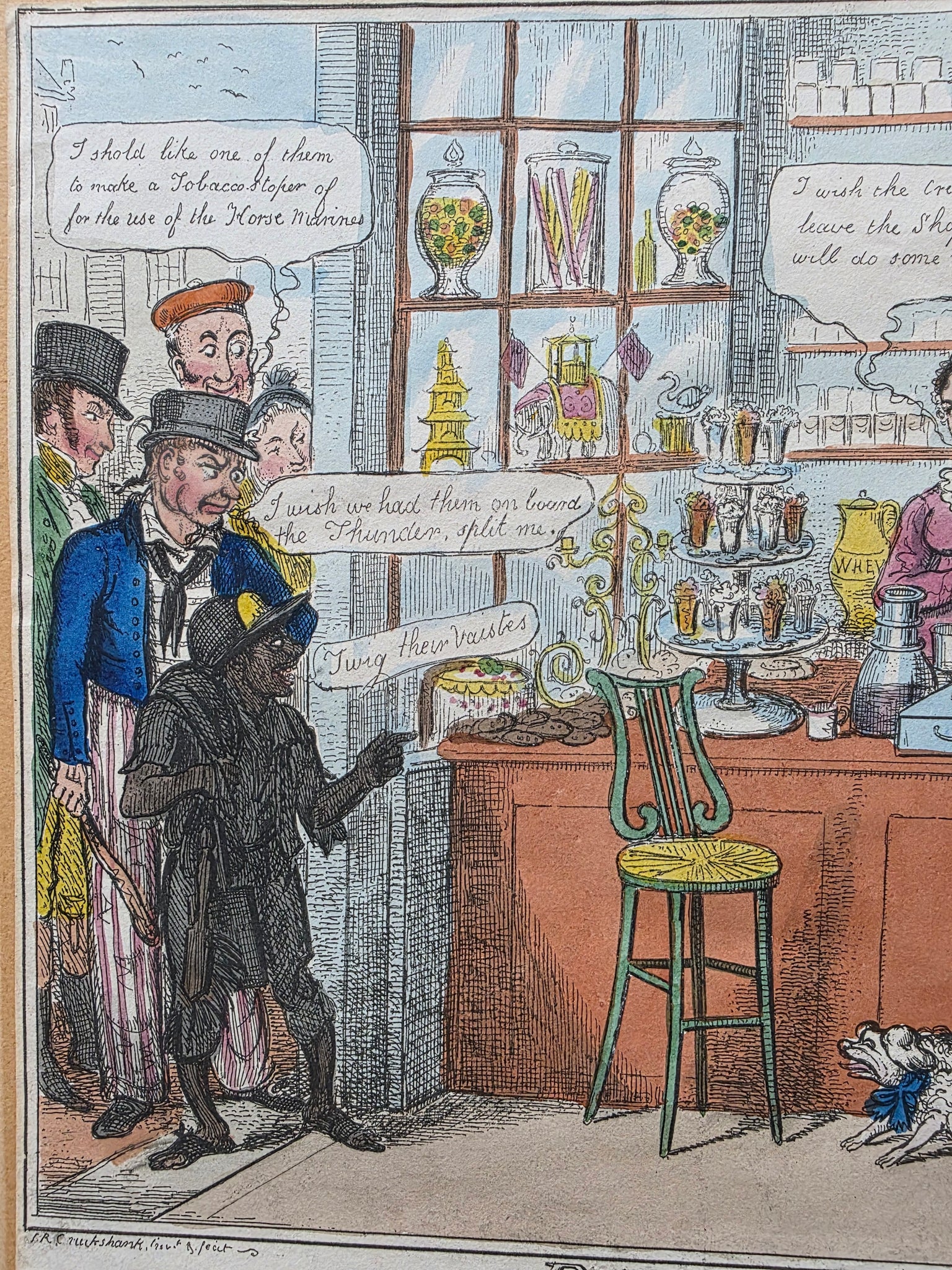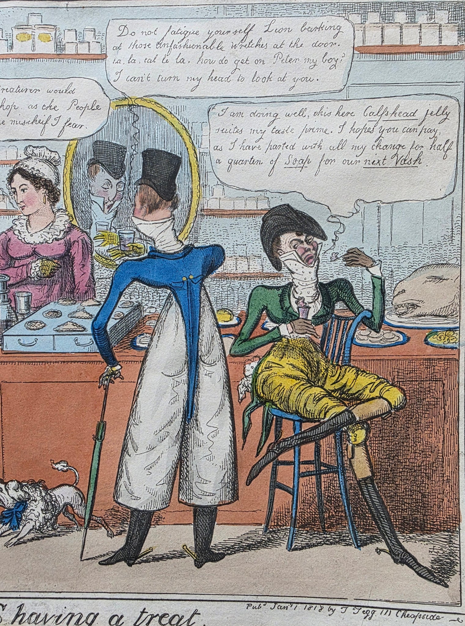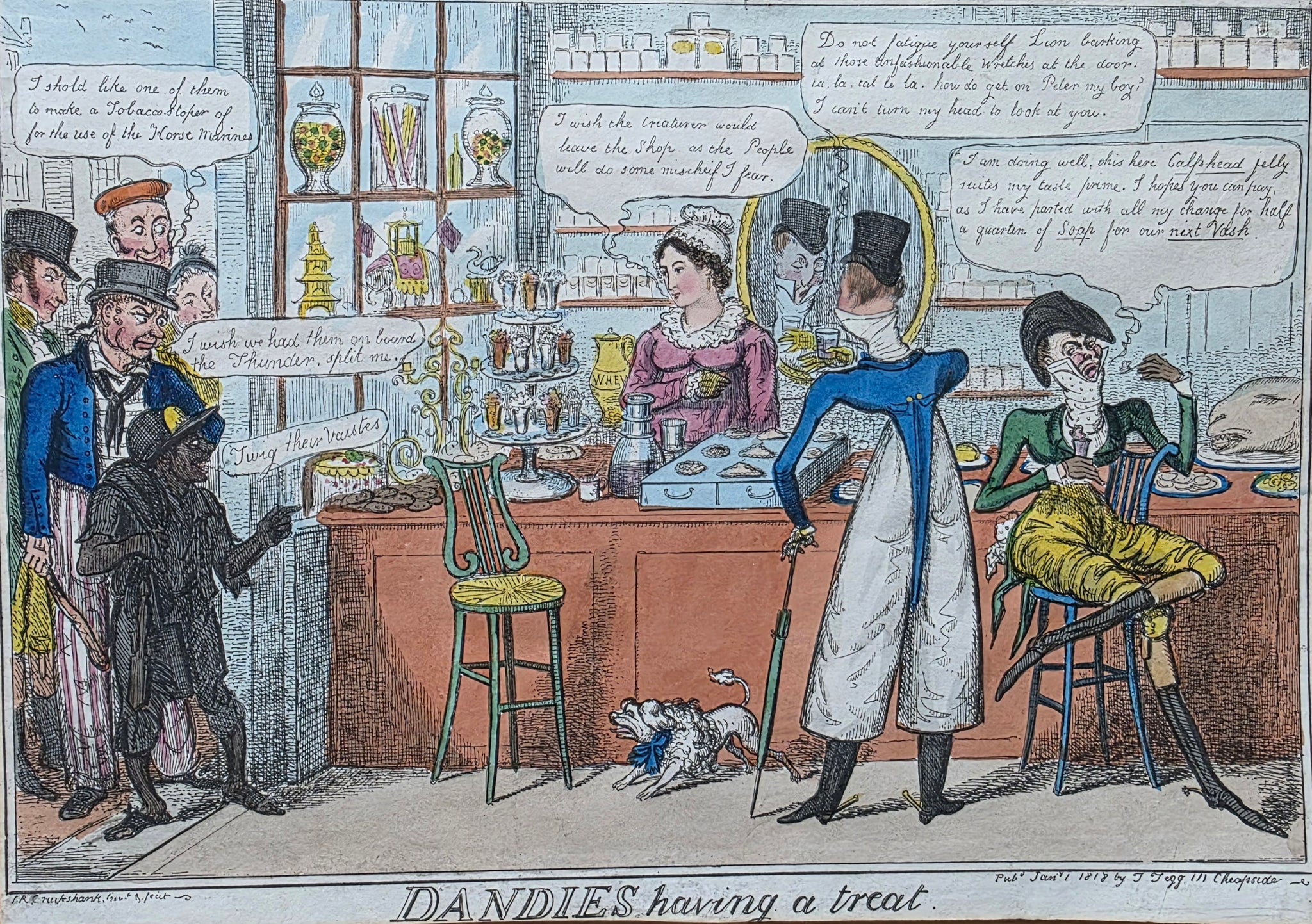 "Dandies Having A Treat" Hand coloured satirical etching by IR Cruickshank. Published by T Tegg, Cheapside January 1818. 33.1 by 23.5 cms. Overall. Printed on early wove paper. Trimmed within platemark, a very nice example.