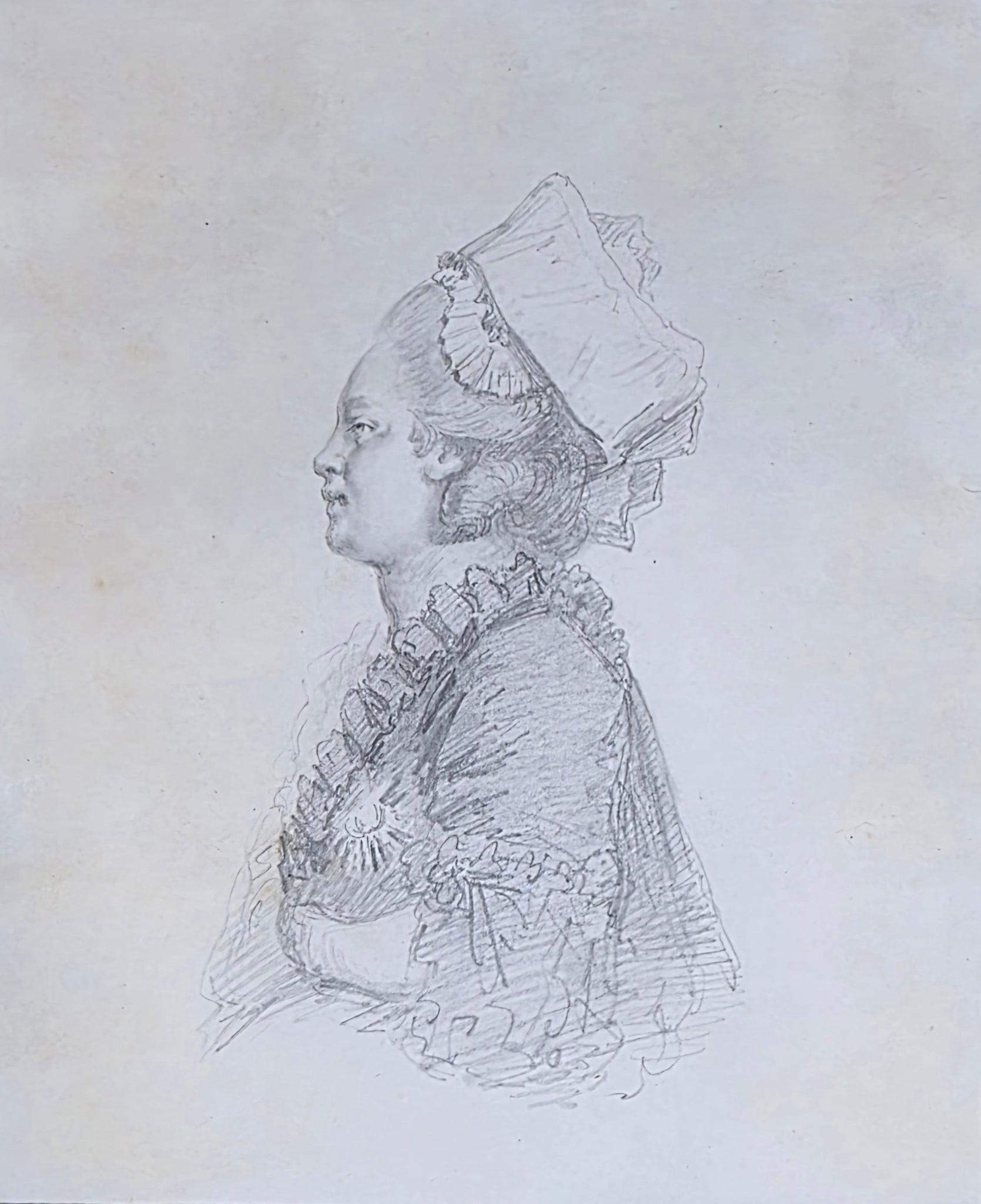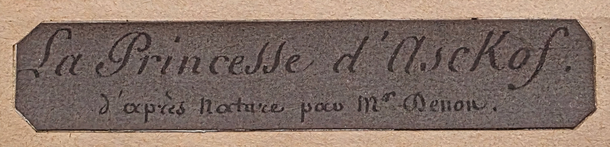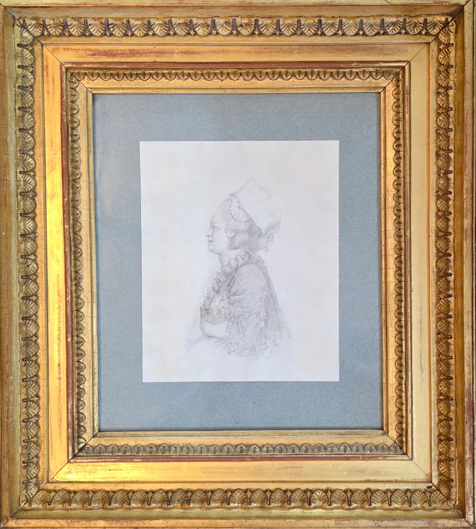Dominique Vivant, Baron Denon 1747-1827. French School 18th.Century. Pencil portrait study of The Princess Yekaterina Romanova Dashkova. Countess Vorontsova 1743-1810. Екатери́на Рома́новна Да́шкова [Воронцо́ва] Graphite on thin wove paper. 13.9 by 17 cms. Sheet. 32.7 by 36.5 cms. Overall in 19th.Century gilt gesso frame. Paper label to reverse "La Princesse d'AscoKof. d'après nature par. M. Denon" Circa.1781.