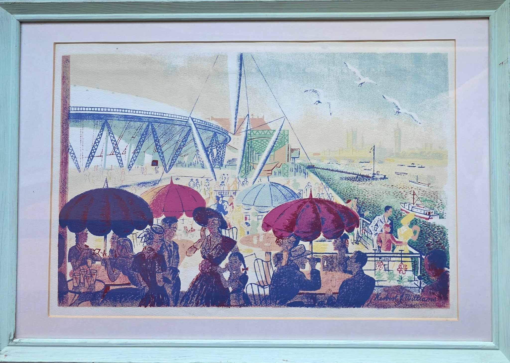 The print was produced to mark the 1951 Festival of Britain Exhibition, the national fair celebrating British achievements in arts, science, and technology on London's South Bank. It depicts visitors enjoying the South Bank promenade, featuring the iconic Skylon structure, the Dome of Discovery and the Palace of Westminster beyond. So evocative of it's time, in it's cheerfulness, colour and post war optimism.