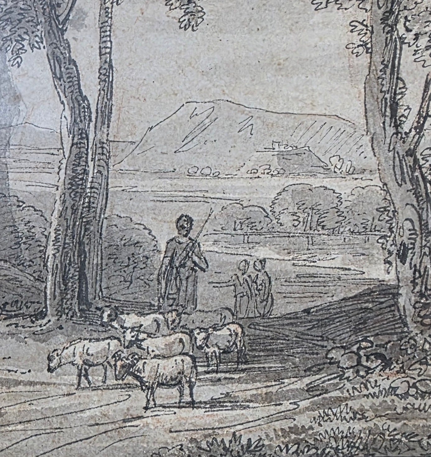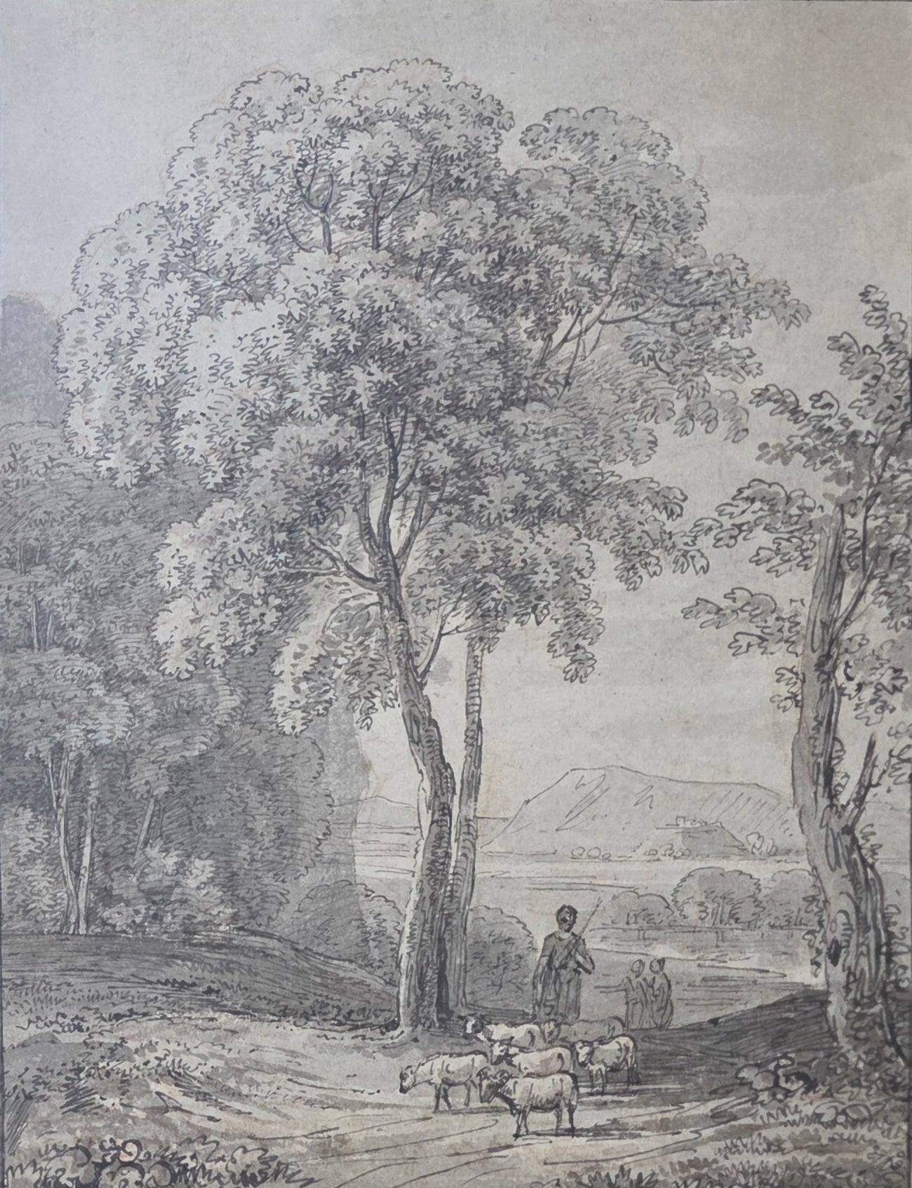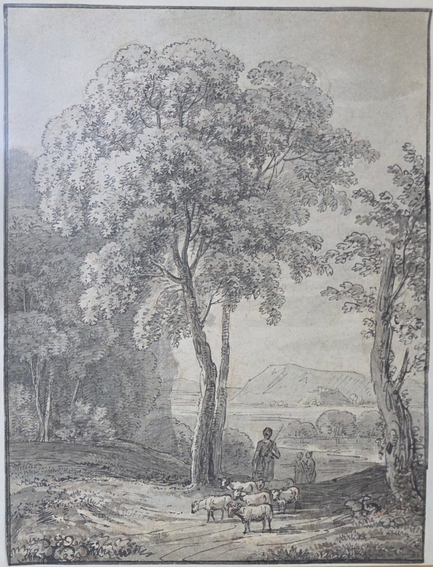 Jean Baptiste Claude Chatelain 1710-1758 18th.Century Pen and Ink Landscape Drawing, A drover and sheep in a country landscape. Circa.1740. 16 by 21 cms image. 35.5 by 41.5 cms. Framed overall.
