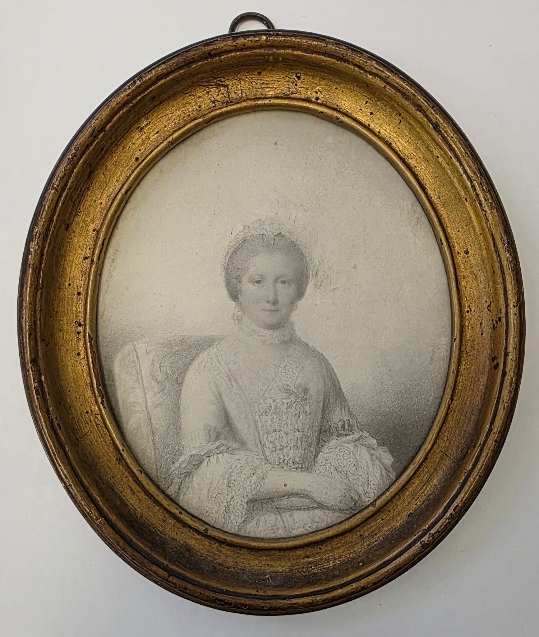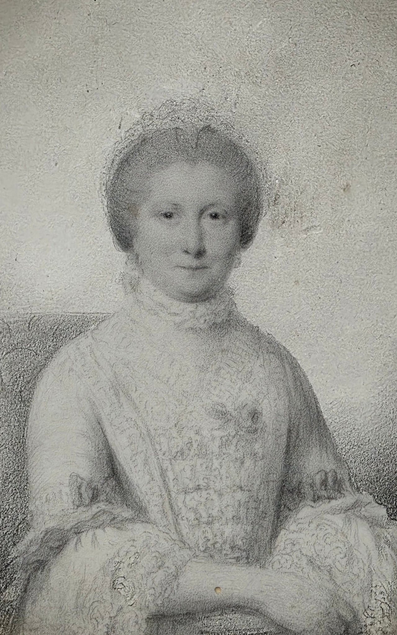 John "Old Taylor" Taylor 1739-1838 British School 18th.Century. An extremely elegant half length portrait of a seated lady, graphite on paper. Circa.1775. Period giltwood gesso frame. 11.3 by 13.3 cms image. 15.5 by 18.1 cms framed overall. Some slight surface grubbiness and one small worm hole to her arm all to no real detriment.