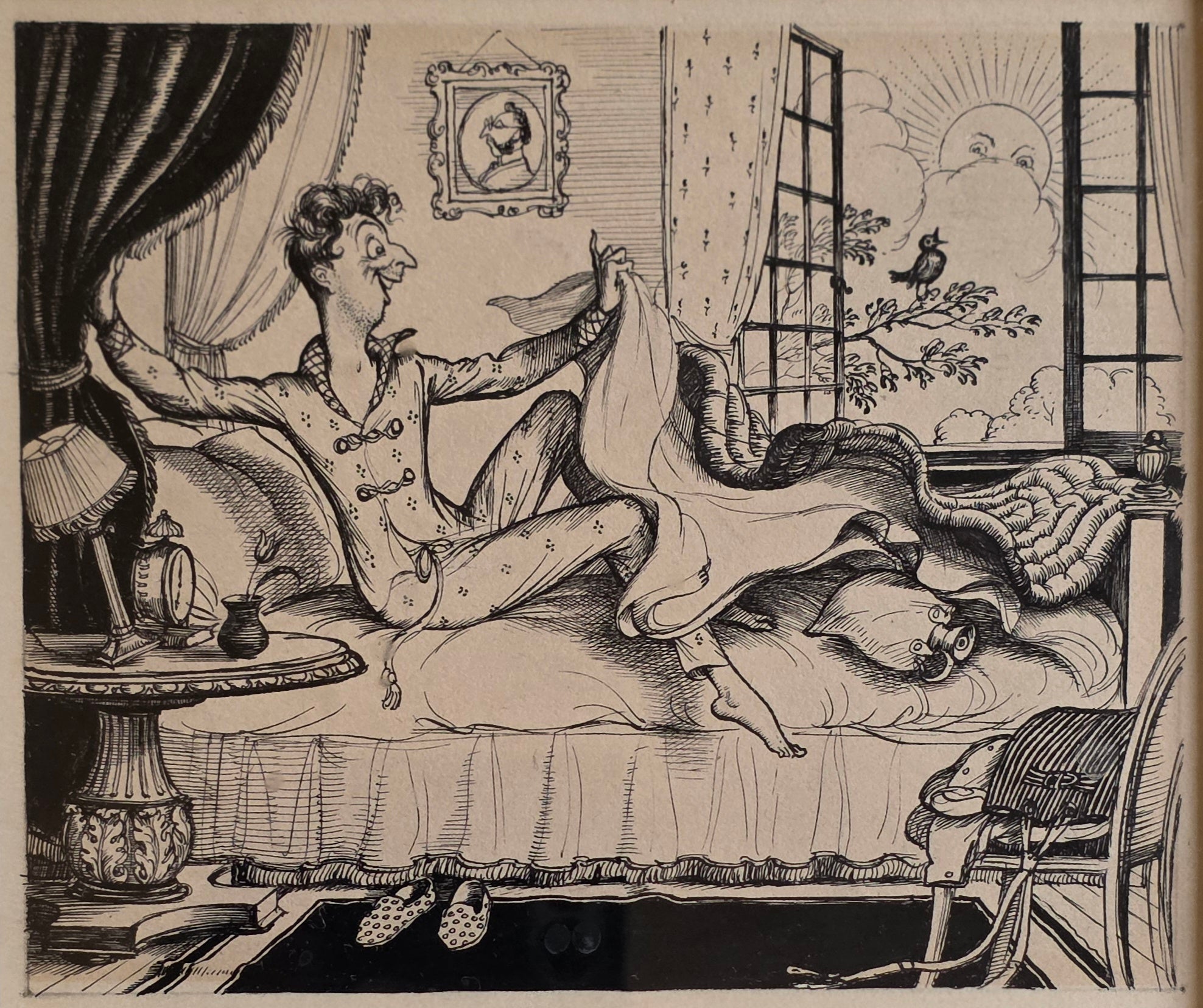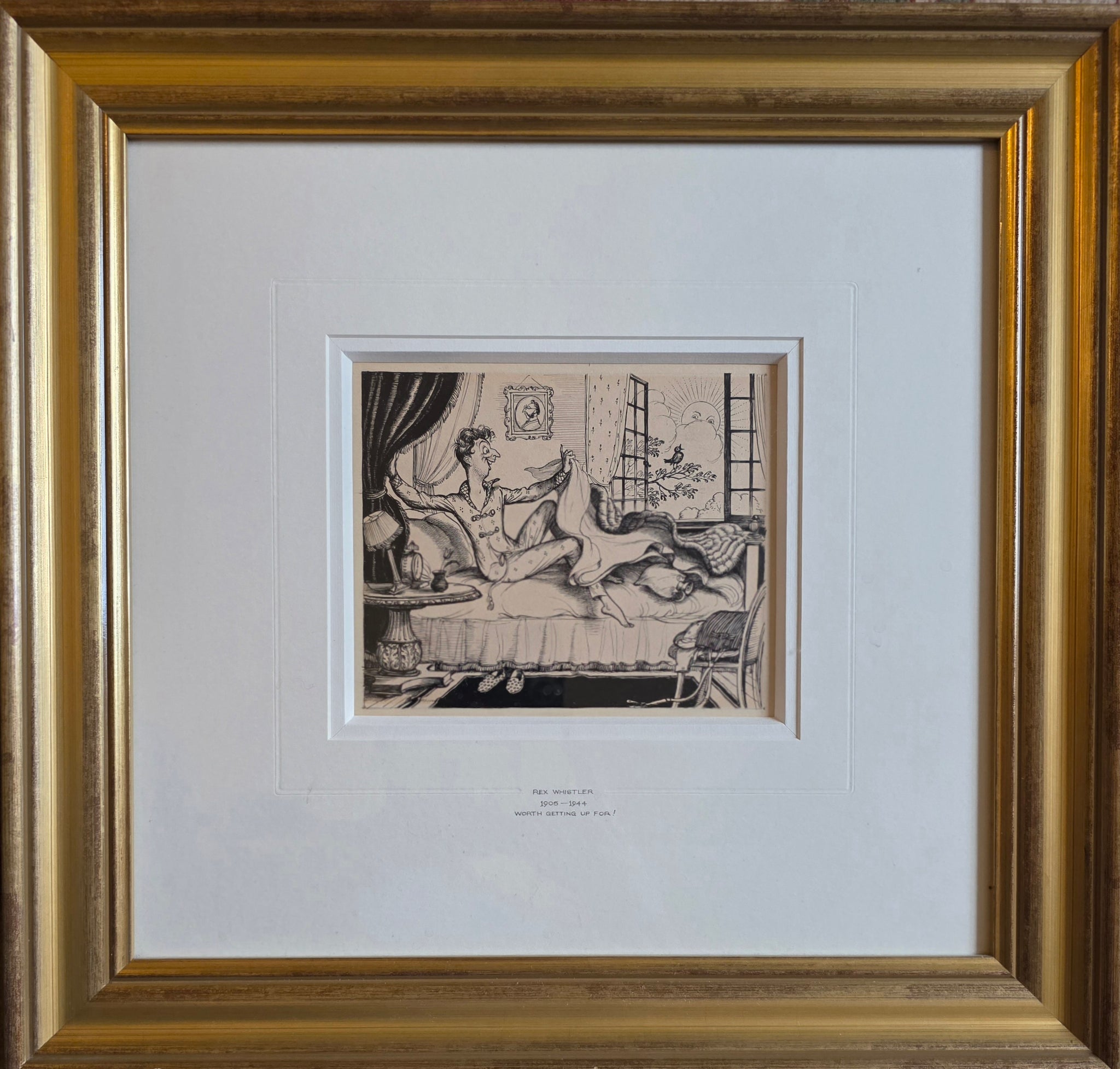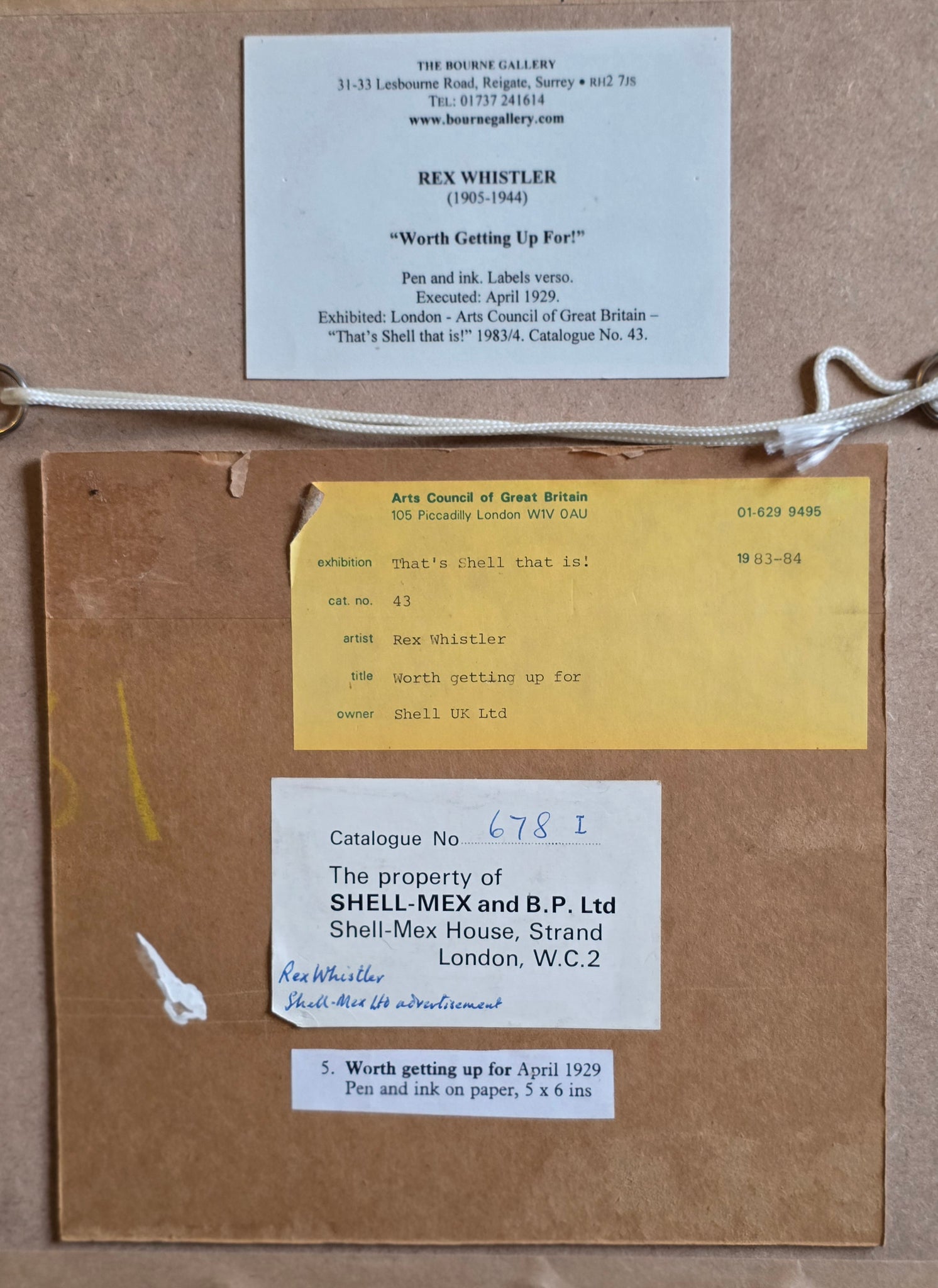 Rex Whistler 1905-1944 British School 20th.Century. Original Pen and Ink drawing. "Worth Getting Up For!" Design for the Shell-Mex Ltd. Advertisment. Executed in April 1929. Exhibited: London Arts Council of Great Britain "That's Shell that is" 1983/4 Cat. No.43. Provenance: Shell Mex and B.P. Ltd. Private Collection U.K. 16 by 13 cms. Image.
