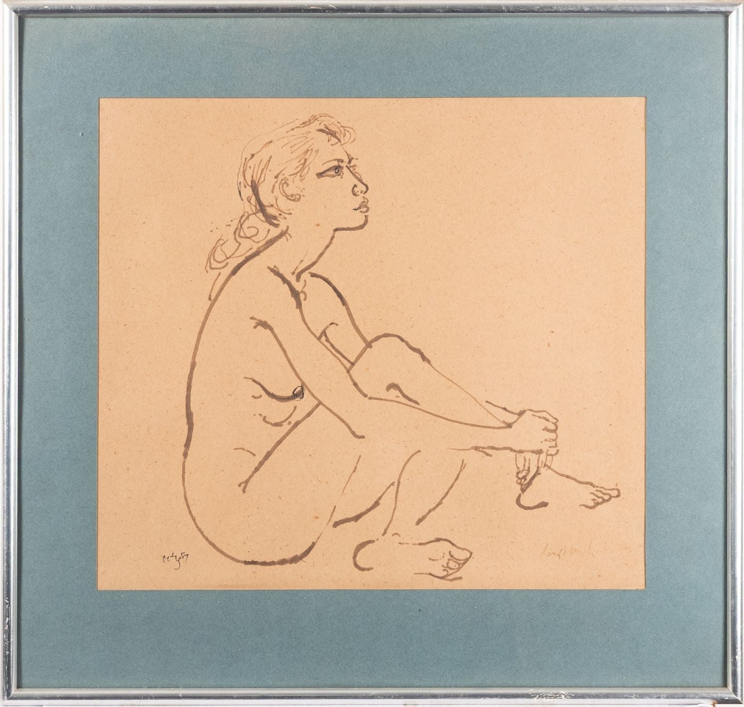 Ronald Searle CBE HRWS 1920-2011 British School 20th.Century. Pen and ink drawing. Study of a female nude Signed and dated October 1957. Provenance: with Magdelene Street Gallery Cambridge. 37.5 by 33.5 cms. 50.5 by 48 cms. Overall framed.