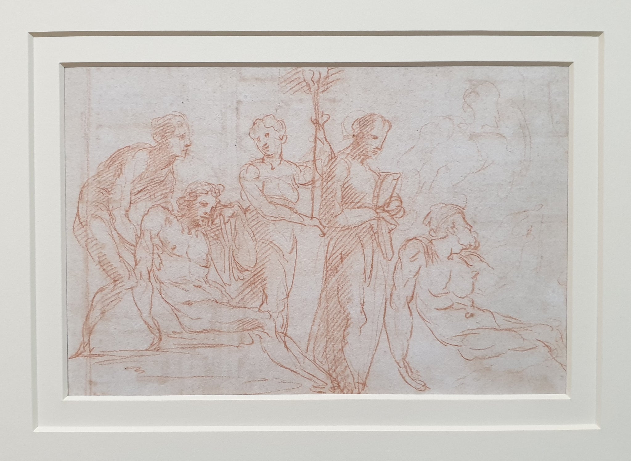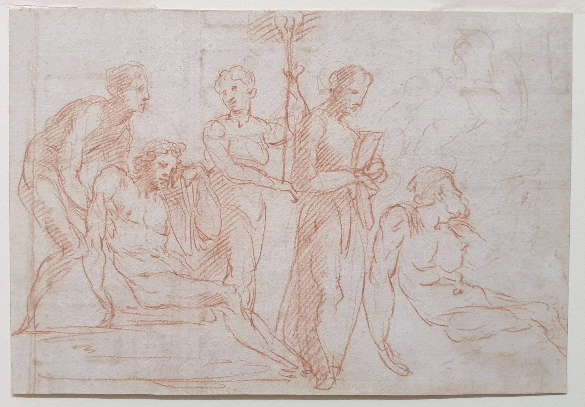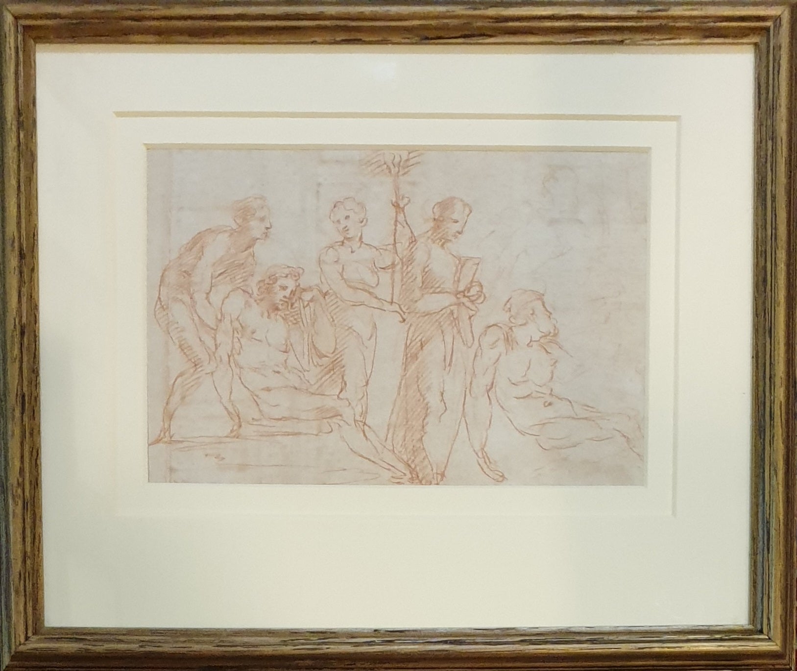Attr. Simone Cantarini called Il Pesarese.1612-1648. Italian School 17th.Century. Red chalk figure studies. 17.5 by 11.5 cms. Image. 28 by 23.5 cms framed overall.